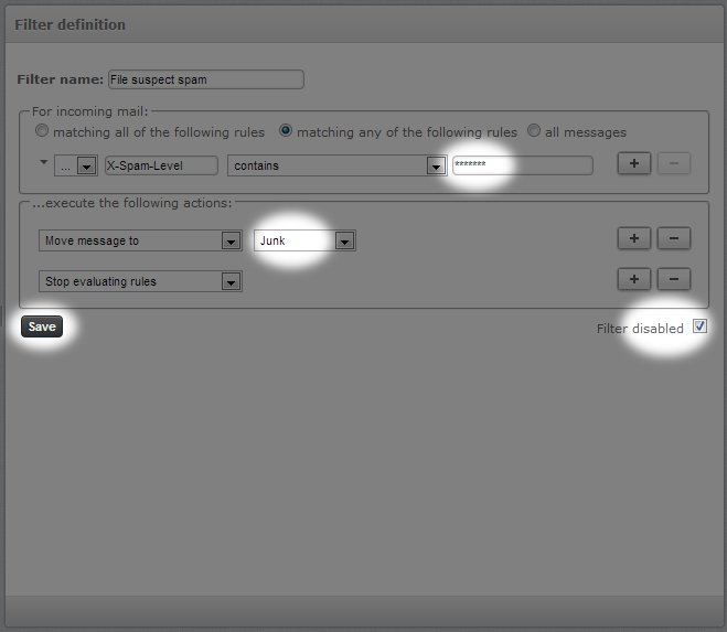 The spam filtering rules can be adjusted to work on higher/lower scores by adjusting the number of asterisks in the 'X-Spam-Level->contains->' box.